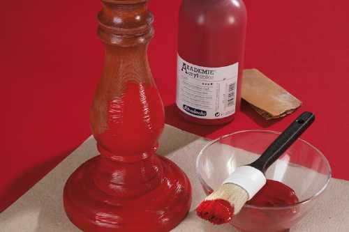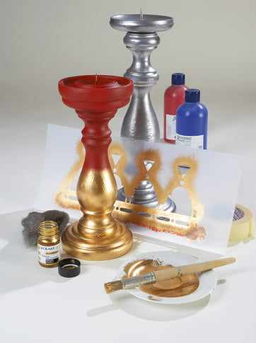 The substrate for this wooden candleholder must be pre-painted with an acrylic paint before the liquid gilding. The best match for gold and bronze is red, and for silver and gunmetal is a cool blue.