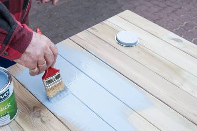 - Colour: Wood preserving varnish; here: Coloured lacquer in grey and semi-gloss