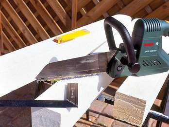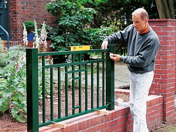 With the help of the spirit level, the fence sections are positioned on a trial basis, then the boreholes are marked for the fastening of the sections.