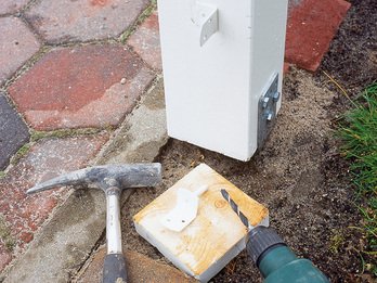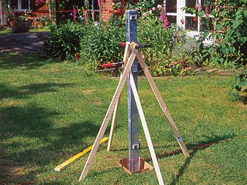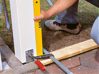 The fence posts are concreted directly in. For this purpose, a square hole is dug, the post is inserted and aligned with the help of four slats. Fix the slats with screw clamps. They support the post until the concrete has been tied off.