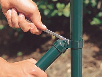 The struts and the posts are screwed together. For this purpose, there is a special clamp as a connecting piece. Only when the clamp is pushed back is the post precisely aligned.