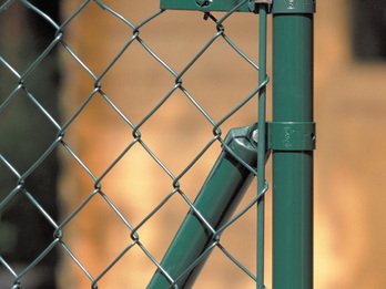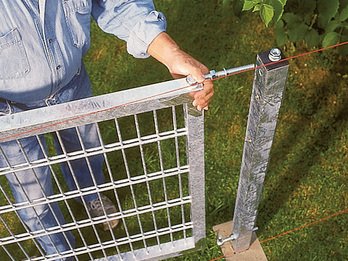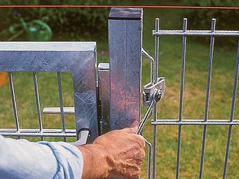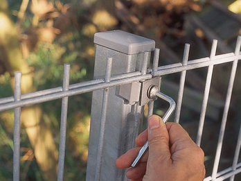 For the fastening of the fence fields there are mounting plates, which are screwed on and clamp both interlocking lattice mats. This works on a straight track (pictured) and on large-angled inner corners. At these corners, the two perpendicular grids are captured by the mounting plate. There are special corner posts for outer corners and inner corners with smaller angular dimensions.