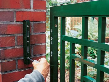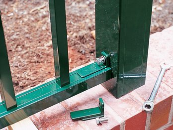 The matching gate is fastened to the top and bottom of the post with a screw-through lob. Plug the lobs through, screw the nut on and adjust the gate so that it hangs exactly parallel to the post. The stop box for the lock is screwed to the opposite posts.