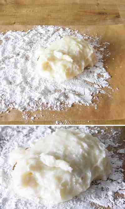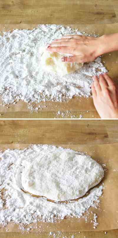 8th step: As soon as the dough has cooled down slightly, gently flatten it with your hands (which you have dusted with cornstarch beforehand) and spread more cornstarch on top so that the dough does not stick when rolling out.