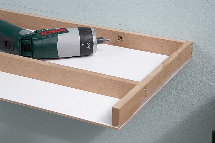 The tray consists of MDF and a white coated HDF plate (hard fiber). As glue we recommend lacquer glue or an assembly adhesive. If the tray is glued and screwed, it is attached to the wall.