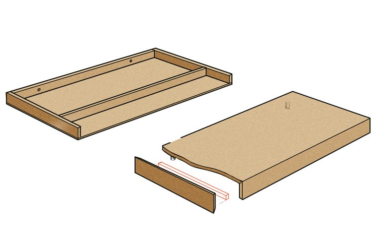 The first idea (pictured above) to make secret compartments in furniture is based on the well-known Ikea shelf “Lack”. Here we have made a hidden drawer in such a way that, if it is well painted, it is indistinguishable from the Ikeas helves. The board could then be combined with proper “paint” shelves and no one will notice that there is a secret compartment in it.