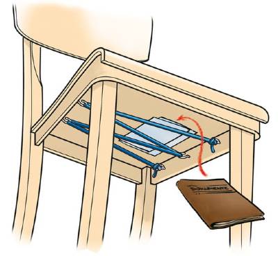 Even a simple chair can be equipped with a secret compartment in just a few simple steps. To do this, drill five small holes at a regular distance below the seat, screw in ring eyelets and hooks and pull in the elastic band (construction market) and knot.