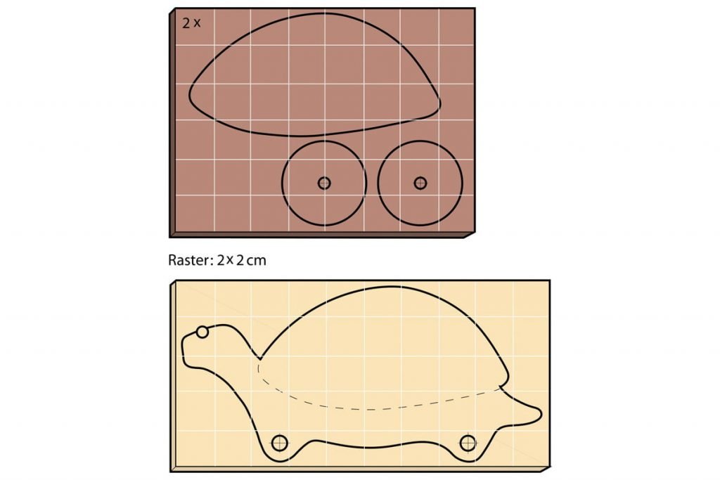 The turtle is built in the same way as the hedgehog. The material thickness is 40 mm for the middle part and 20 mm for the side parts and the disc wheels. The hole of 4 mm for the eye is carried out before sawing. Material cost per animal: about $20 if you have to buy the wood specially — much less if you have offcuts sitting around from other projects.