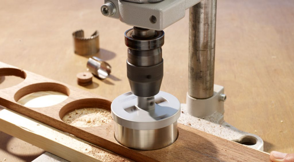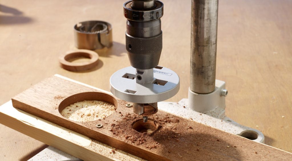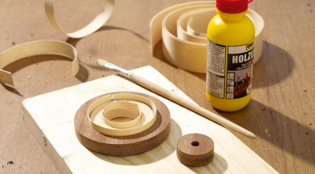 With a hole saw, however, it is not only possible to produce discs: if you change the saw blades step by step, you get concentric rings. They can be reassembled into discs. This doesn’t seem to make sense at first, but if you use different types of wood for this, interesting effects can be achieved through the color contrasts.